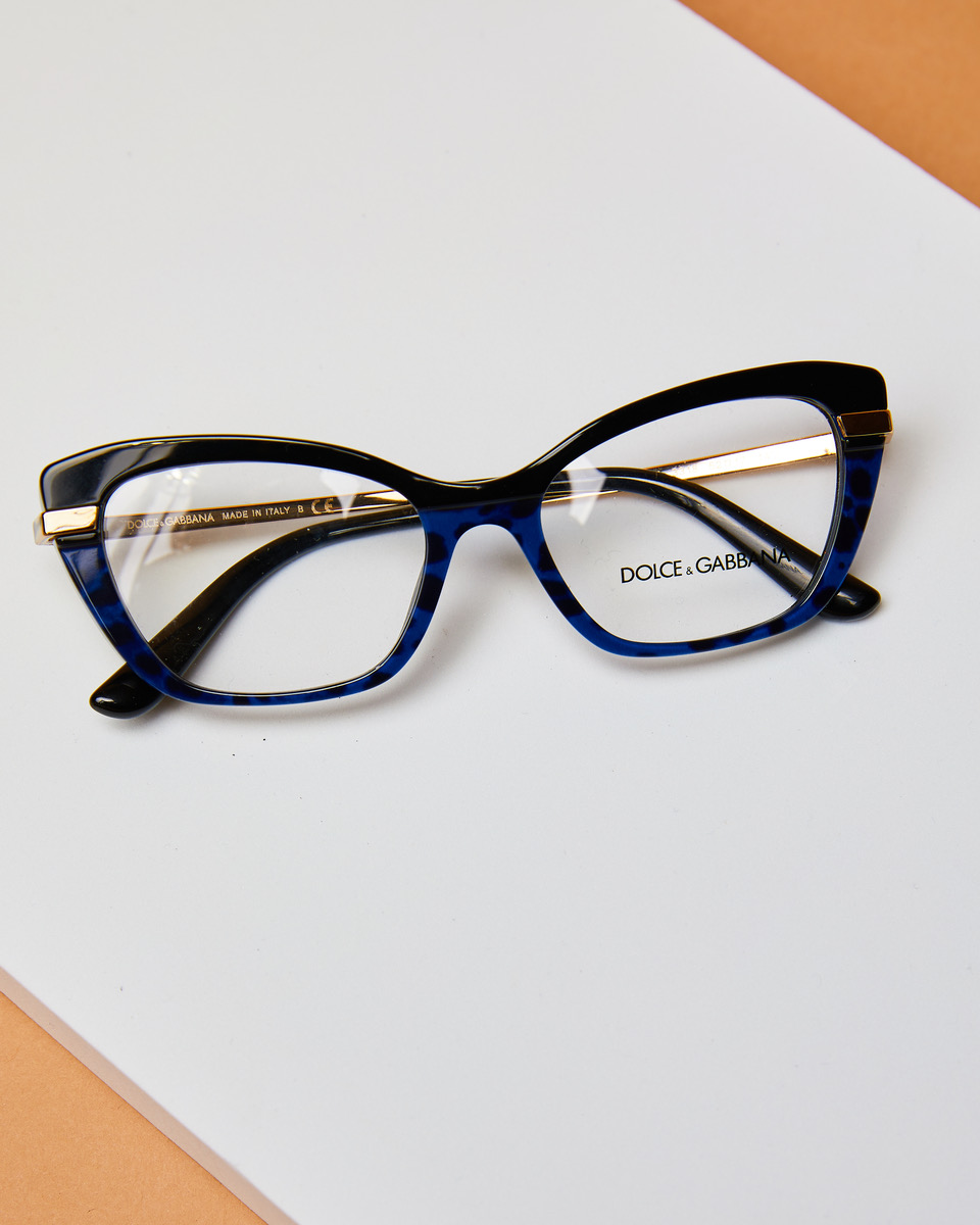 Montatura donna cat-eye bicolore blu nero con aste dorate sottili e confortevoli